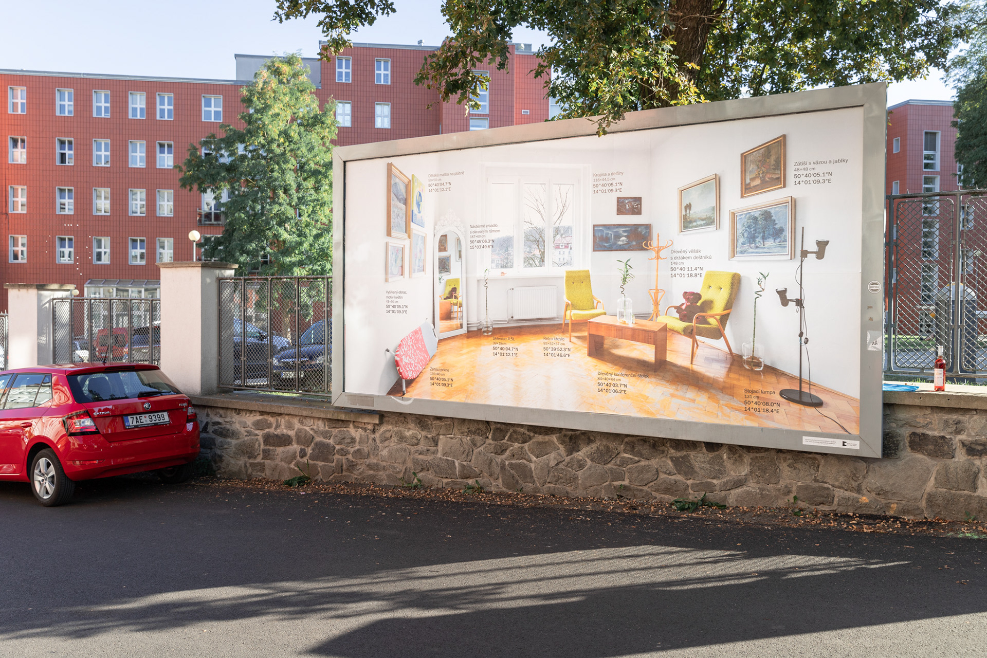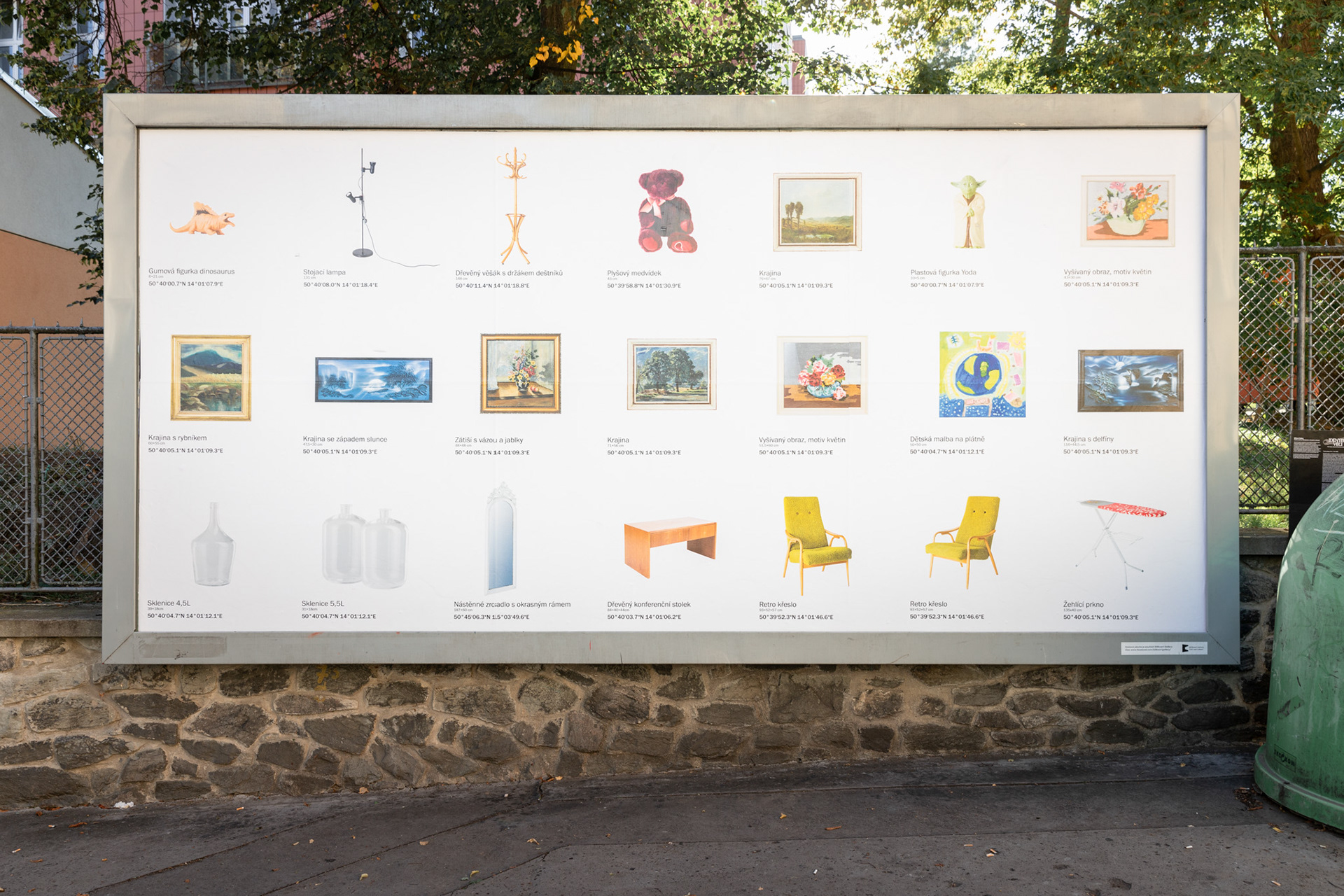 Je ještě možné najít v současném chaotickém světě obrazů, vjemů a slov srozumitelnou cestu? Kde se nachází pravda a kam už sahá lež? Ústecká Billboart Gallery pokračuje ve svém cyklu výstav Manipulace obrazem a slovem, pobízející k zamyšlení se nad vnímáním vizuálních i psaných informací kolem nás. Druhá výstava Identita věcí reflektuje na ploše dvou billboardů fenomén odloženého, avšak často funkčního nábytku a bytových doplňků u popelnic. Přestože zájem o možnosti recyklace ve společnosti stoupá, denně nacházíme ve veřejném prostoru opuštěné a již nepotřebné domácí spotřebiče – nábytek, knihy, obrazy, květiny a jiné interiérové dekorace. Čekají na svého nového majitele a obvykle do pár hodin zmizí. Jaká je identita těchto věcí a jaký bude jejich další osud? Nepřispívá tomuto jevu naše uspěchaná doba a enormní nárůst obrovských obchodních řetězců, které nás nutí nakupovat stále nové produkty, sloužící však jen několik málo let? Trojice umělců Lucie Hyšková, Petr Kubáč a Alexandra Naušová se rozhodli na jedné z výstavních ploch zvěčnit zinscenovaný digitálně upravený interiér, tolik typický pro katalogy designových velkoobchodů s nábytkem. Místo očekávané ceny u jednotlivých produktů však nalezneme GPS souřadnice polohy, kde byl konkrétní kus nalezen. Výstava Identita věcí tak upozorňuje na tlak velkých firem, které manipulativně útočí pomocí promyšlené vizuální reklamy na naše podvědomí. V něm se opakovaně ukládá stále větší počet podobných obrazů výrobků i krátké propagační slogany. Každodenně je vidíme kolem nás. Nelze si jich nevšimnout. Můžeme vůbec těmto nátlakům uniknout nebo se nějak účinně bránit a vystoupit ze zaběhlého konzumního cyklu?