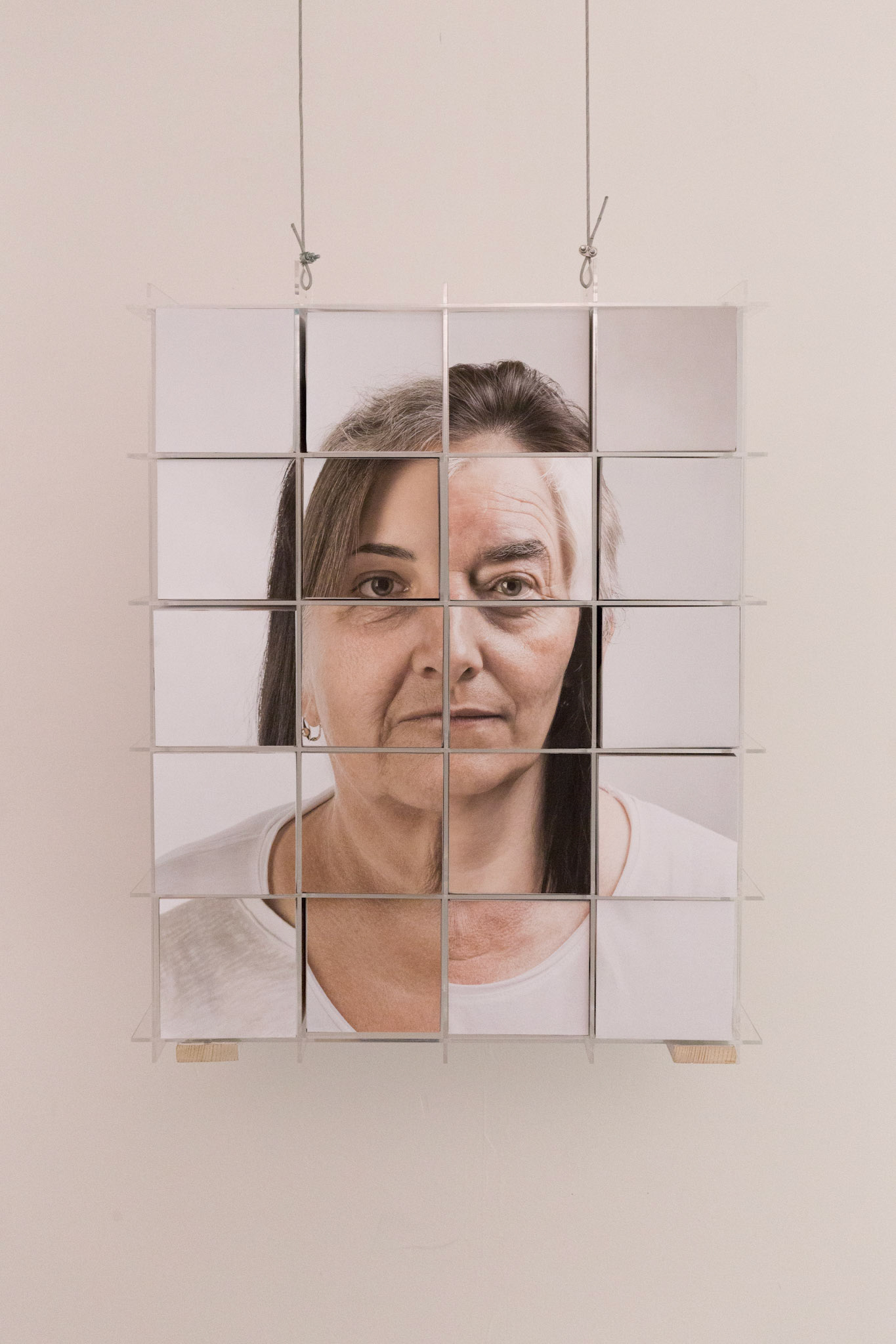 2. Fotografie jsou aplikovány na krychle, které po vzoru dětské skládačky můžete zasunout do závěsné konstrukce z plexiskla a tak měnit části tváře