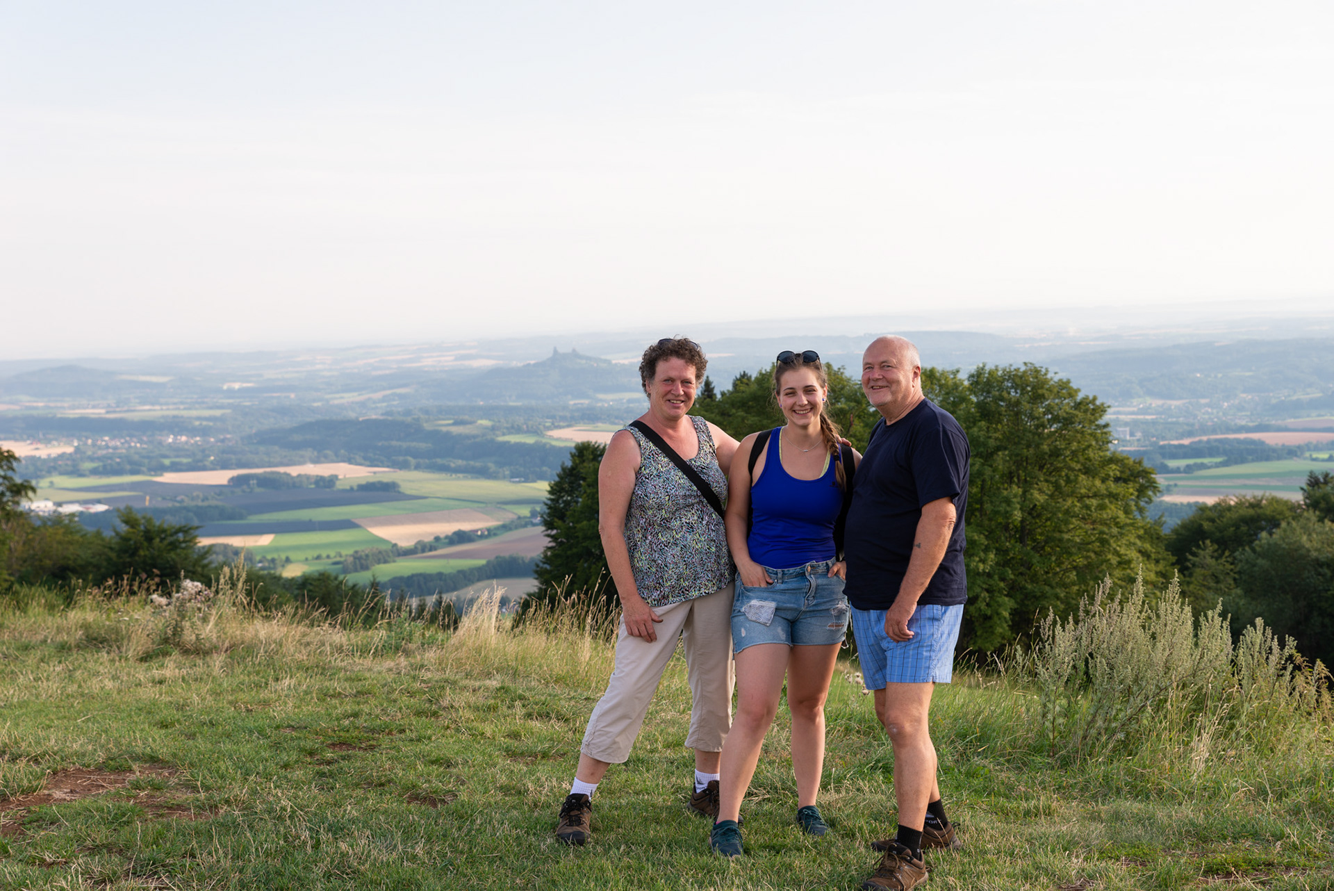 Jdem lesem, loukou a další vyhlídka, tady taťka jako malej lezl po skále. Zjišťuju že jediný co mám dělat je naslouchat. Cestou k autu jsme zmokli.